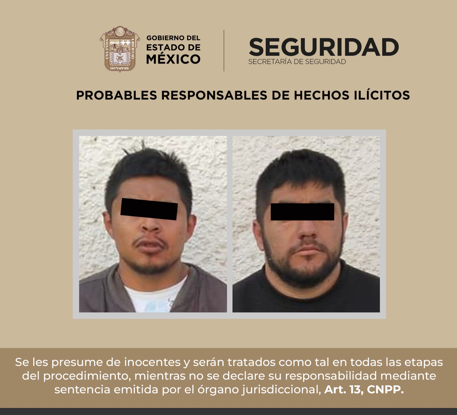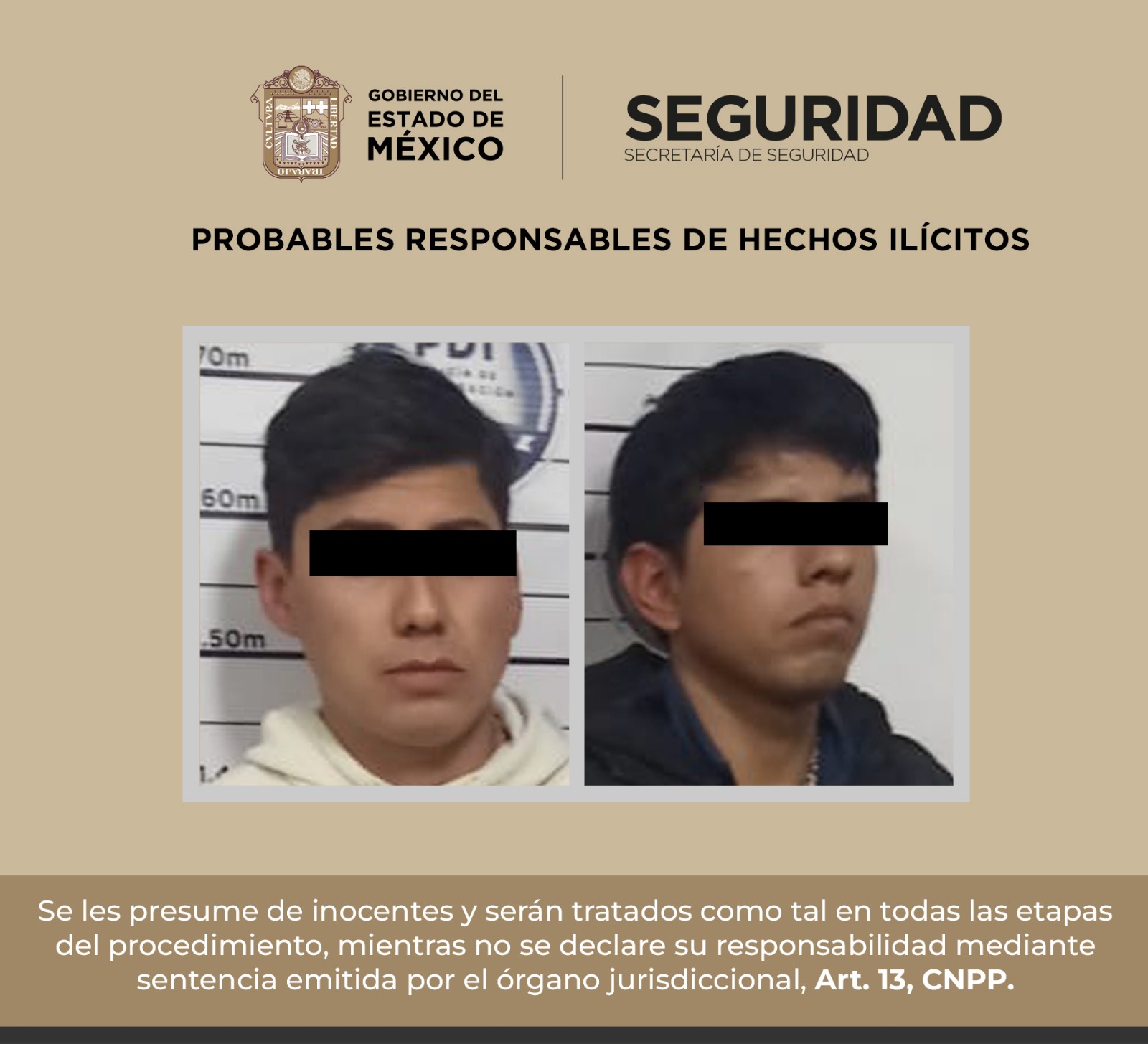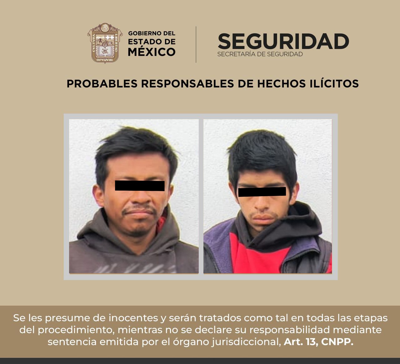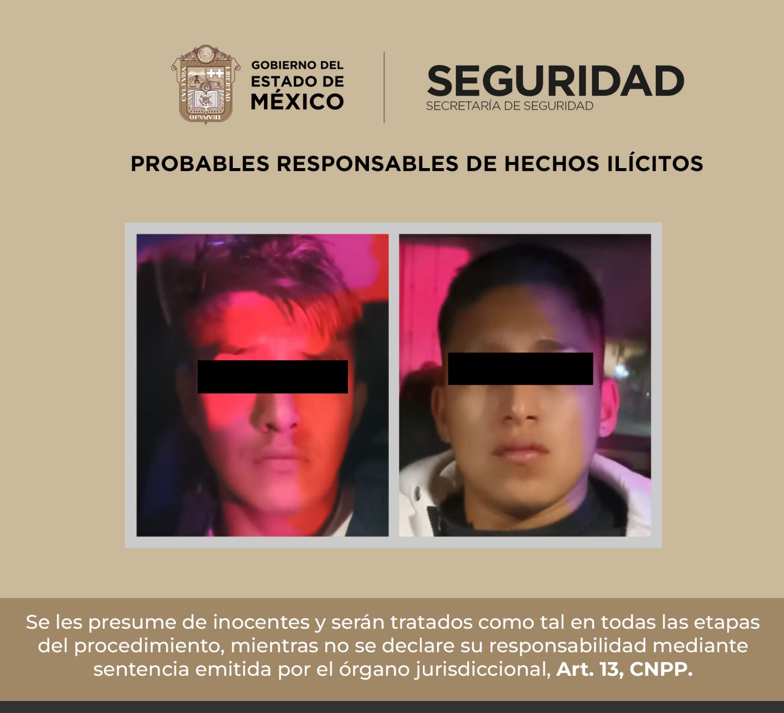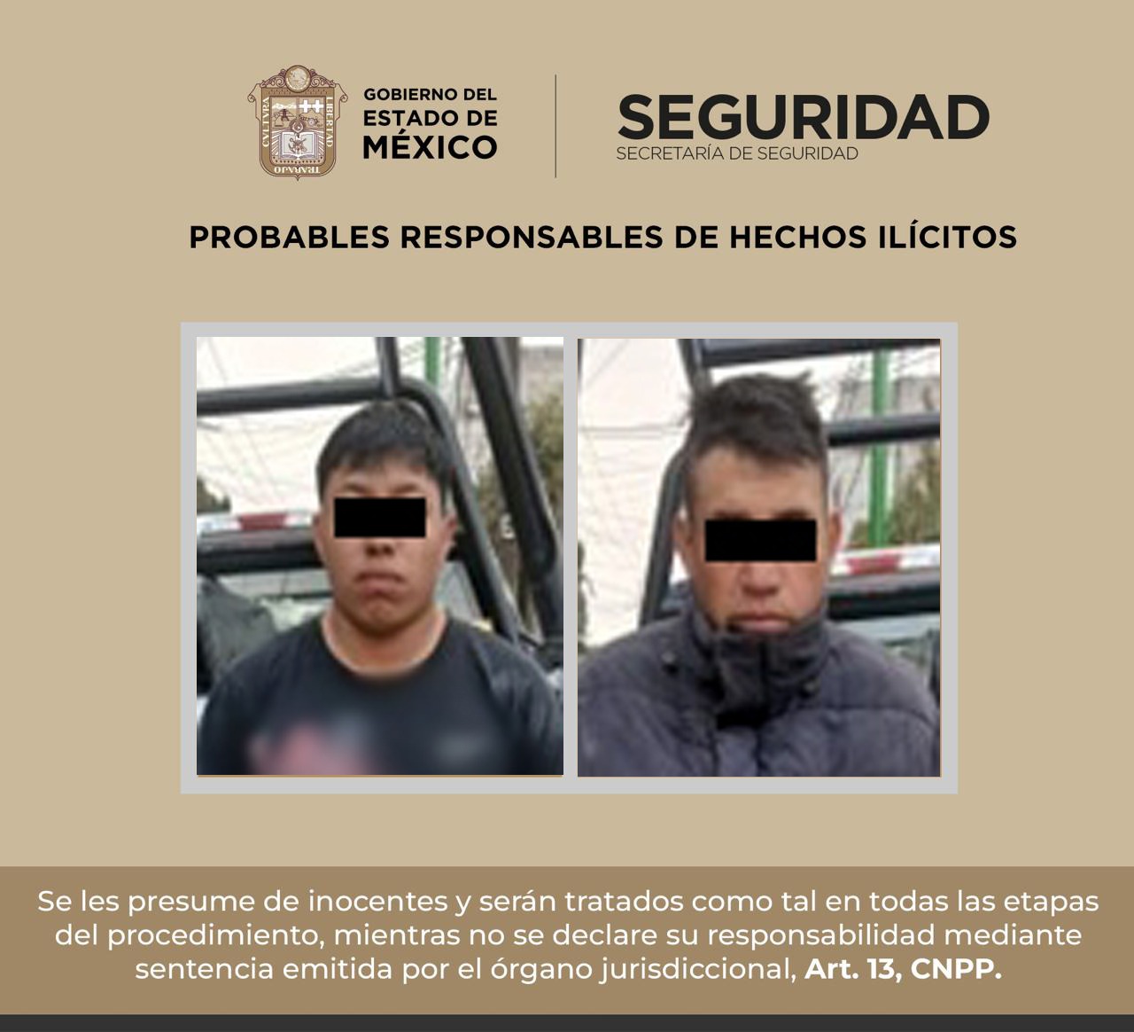 La rápida respuesta de elementos de la Secretaría de Seguridad del Estado de México (SSEM) derivó en la detención de dos hombres, posibles responsables del delito de robo de vehículo con violencia.
