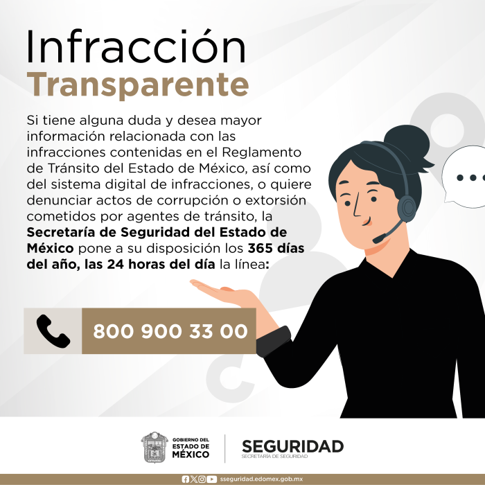 La Secretaría de Seguridad del Estado de México cuenta con líneas de atención especializada para brindar servicios de emergencia, recibir denuncias anónimas, proporcionar orientación a la ciudadanía en información referente a infracciones de tránsito, entre otros.Código de emergenciasDenuncia anónimaInfracción transparenteCuando haces uso de estos teléfonos, pones en acción a los cuerpos de emergencia que atenderán tu llamado. Si no requieres ayuda, no llames, otros podrían necesitar el servicioRecuérdalo, úsalo, cuídalo.Código de emergencias 911Con el uso del Código de Emergencias 911, la ciudadanía podrá solicitar el apoyo de la Secretaría de Seguridad del Estado de México, Policías Municipales, Fiscalía General de Justicia del Estado de México, Cruz Roja, Bomberos, Protección Civil y el Sistema Nacional de Atención de Emergencias.Todas las llamadas de emergencia serán atendidas en los Centros de Control, Comando, Comunicación, Cómputo y Calidad, mejor conocidos como C5 de Toluca y Ecatepec, las cuales serán canalizadas de manera inmediata a las dependencias correspondientes.El Código de Emergencias 911 es gratuito en equipos de telefonía fija y móvil, así como teléfonos públicos y sin saldo. Además, se podrán enviar mensajes de texto (SMS) sin costo alguno, por lo que la Secretaría de Seguridad invita a los mexiquenses a hacer un uso responsable del Código de Emergencias 911, ya que cada mes, a nivel nacional se reciben 10 millones de llamadas de auxilio, de las cuales alrededor del 90 por ciento son falsas.Denuncia anónima 089El 089 es una línea telefónica gratuita que recibe denuncias anónimas de quienes conocen hechos que pudieran ser constitutivos de un delito. Opera las 24 horas los 365 días del año.El 089 garantiza el anonimato de los denunciantes y permite a la ciudadanía proporcionar información sobre personas que cometen actos que afectan a la sociedad.A cada denuncia se le asigna un folio que permite darle seguimiento oficial y estas son canalizadas de forma inmediata a la autoridad competente.¿Por qué el 089 es independiente al 911?El 089 es un número que no cuenta con registro telefónico, ni solicita datos del denunciante.El 089 es un enlace entre las autoridades y ciudadanía para la persecución e investigación de los delitos, por lo que la atención no es inmediata.Los tiempos de respuesta en el 089 dependen de las autoridades competentes que se dedican a su verificación e investigación; por lo que no cumplen con los tiempos establecidos para la atención de una emergencia.El 089 es un número que brinda atención especializada a la ciudadanía, basada en datos que son considerados constitutivos de hechos delictivos, que para su atención requieren de ser investigados por las autoridades competentes antes de generar una acción.Denuncia anónima en línea Infracción TransparenteA través de este servicio podrás consultar cualquier duda relacionada con tu infracción de tránsito o reportar actos de corrupción por parte de oficiales en el Estado de México.